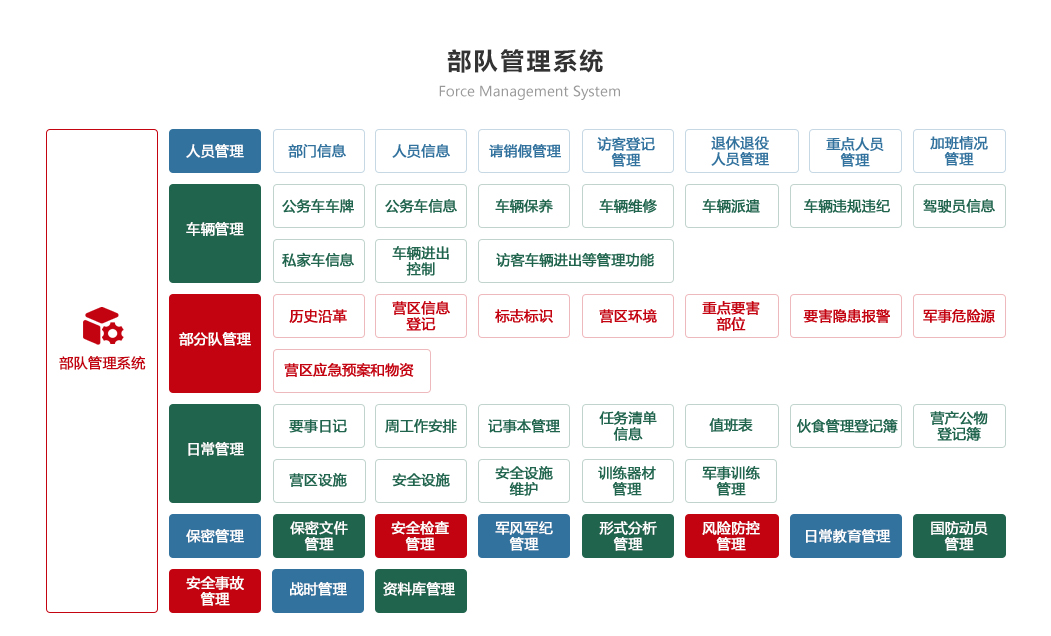 部隊管理系統基于對營區內人、車、dy、崗哨等建設要求,結合軍隊自身特點及應用現狀,實現網絡化管理,提高人、車等管理的效率。可以提高響應能力,構建人、車、q、d、密的全方位綜合管理的部隊系統,保障整體系統高效、穩定、安全運行,提升部隊全面信息化建設層次